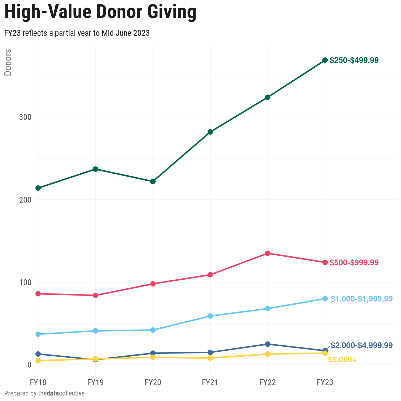 The chart above looks at the number of unique donors for different value bands over time. Ultimately, it looks like we’re seeing a decline in the volume of people in the $500-$999 group and the $2,000-$4,999 group. This raises questions about the cause. Was it because investment in adequate resources hadn’t been made or because we hadn’t finished the year? It could be either or both.