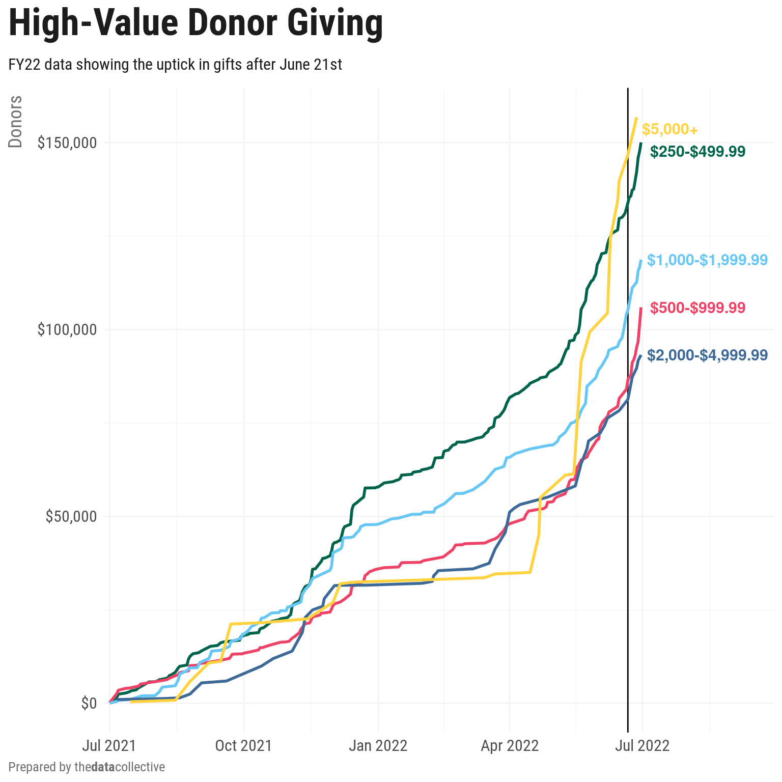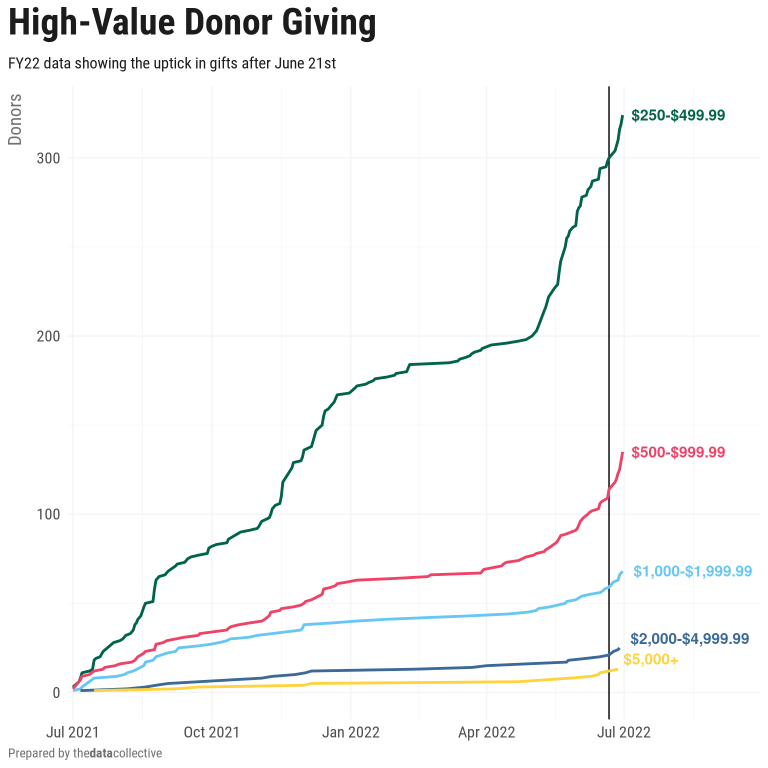 The chart above paints a helpful picture that applies to income and when donors give the financial year. After our measurement line on June 21, you can see that we still see a reasonable increase in the number of donors giving in the last 9 days of the financial year.